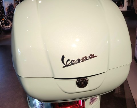 Original Vespa Gepäckträger (chrom) und Topcase in Fahrzuegfarbe inkl. Rückenlehne.